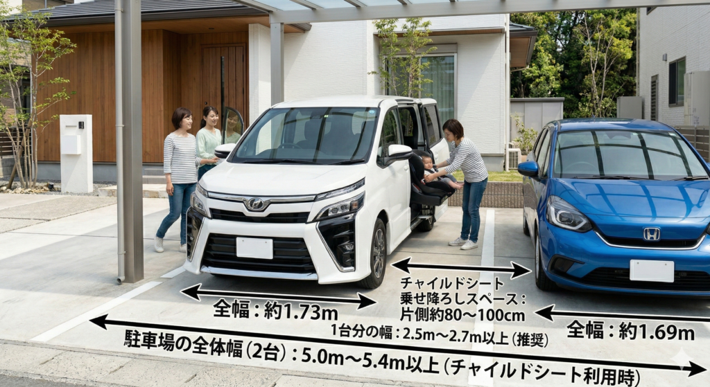 特にファミリー層に人気の中型ミニバンは、スライドドアを採用しているため、隣の車への「ドアパンチ」のリスクは減ります。しかし、運転席や助手席は通常のスイングドアであるため、運転手自身の乗り降りのために十分な幅を確保しなければなりません。また、チャイルドシートに赤ちゃんを乗せ降ろしする場合は、ドアを全開に近い状態にする必要があるため、片側だけで80cm〜100cm程度の余裕(駐車場幅として2.7m以上)があると理想的です。