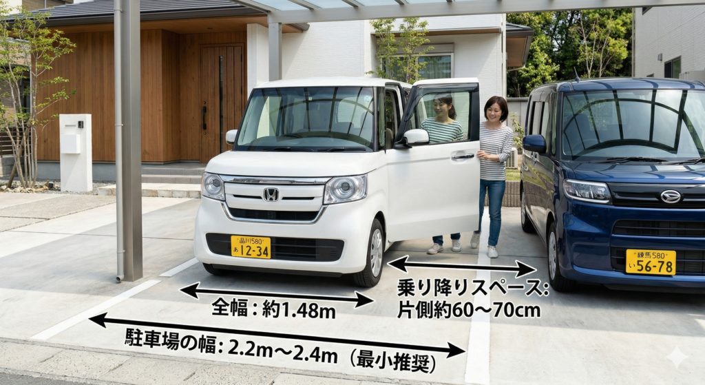 軽自動車の規格は「全幅1.48m以下」と定められています。したがって、車体幅(約1.48m)+乗り降りスペース(片側約60cm〜70cm)を考慮すると、駐車場の幅は「最低2.2m〜2.4m」が必要です。
