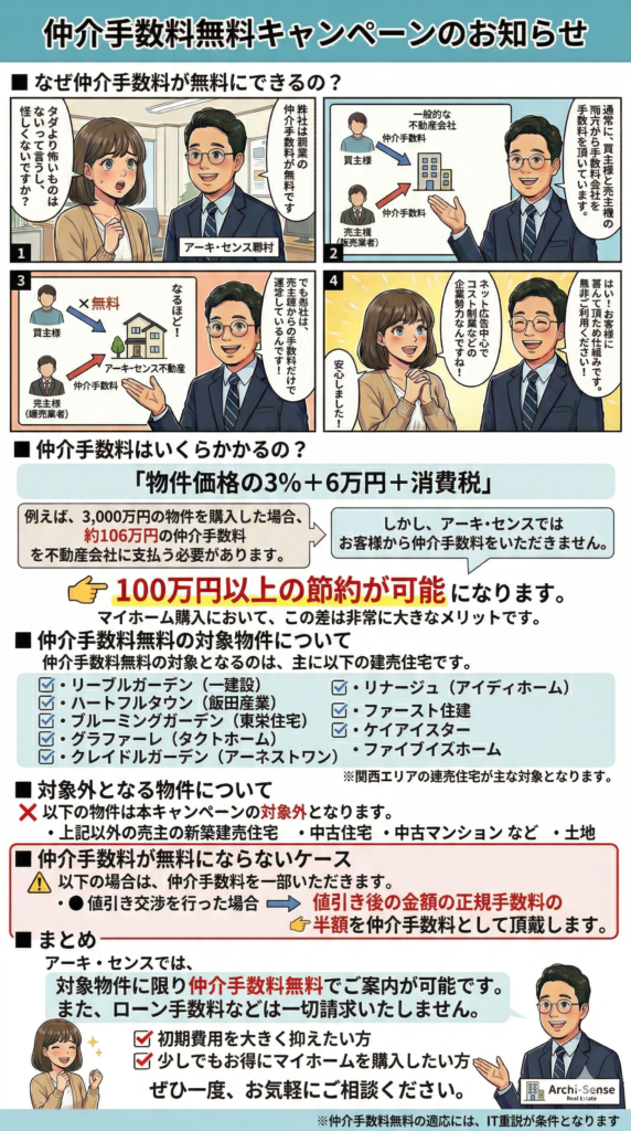 • 仲介手数料「無料」のカラクリを知る:不動産会社が売主(建築会社)から直接手数料をもらう仕組みであり、怪しいものではありません。「両手仲介」を「片手仲介」にしてお客様に還元している企業努力の結果です。
